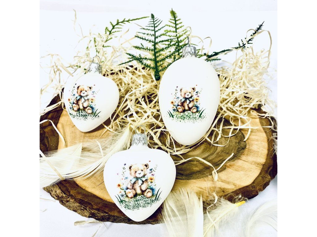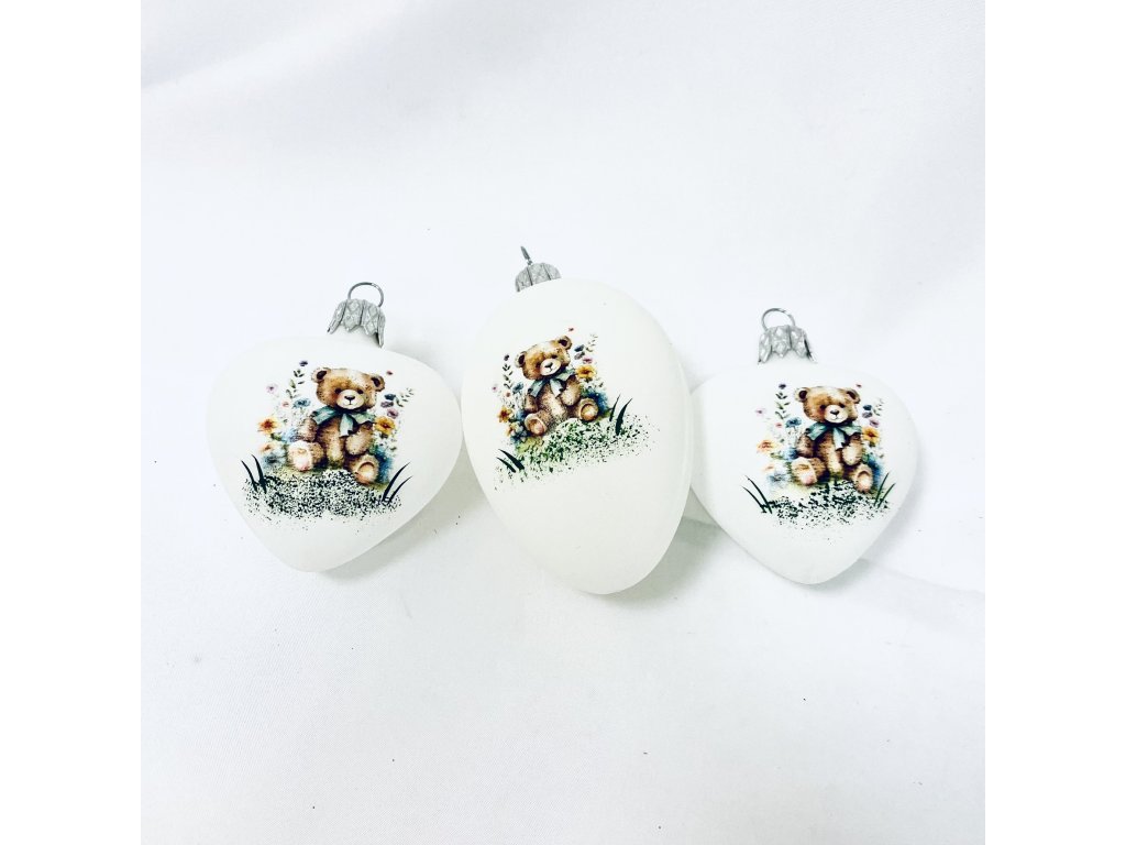 PESACH skleněné velikonoční vajíčko a srdce – s dekorem medvídek 3ks, 10 cm a 7 cm