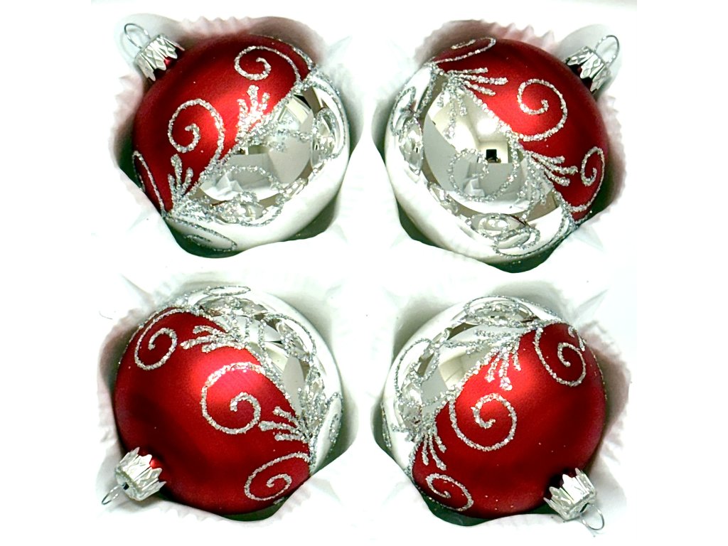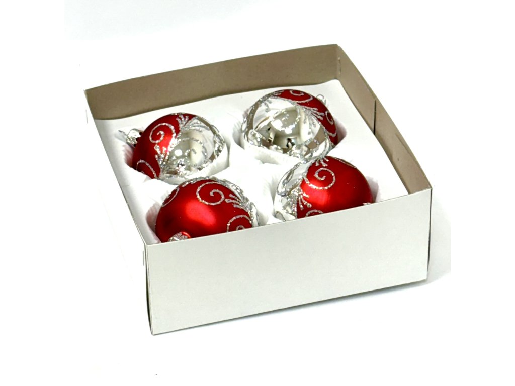 Skleněná vánoční koule Ø 7 cm – Červeně‑stříbrná arabeska (sada 4 ks)