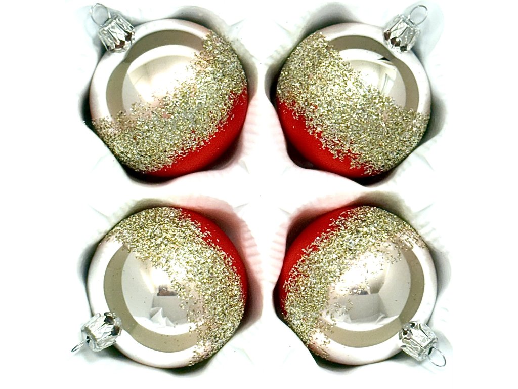 Elegantní šikmý řez dodává klasické kombinaci šampaňského lesku, vášnivé červené a zlatého třpytu moderní dynamiku. Každá koule je ručně vyfoukaná v beskydské sklárně IRISA. Část povrchu dostává vysoký zrcadlový nástřik v jemném odstínu champagne, zbývající plocha je barvena do sametově matné rubínové. Na diagonálním styku obou tónů je ručně nanesena široká vrstva extra jemného zlatého glitru, který plynule přechází a při osvětlení vytváří jiskřivý efekt.
