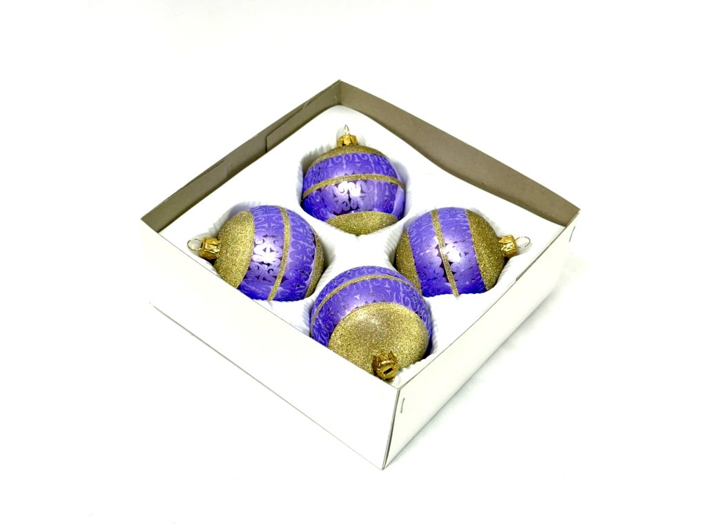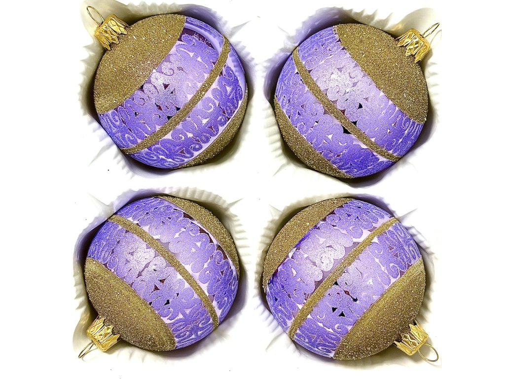 Skleněná vánoční koule Ø 7 cm – Fialový samet & zlaté pruhy (sada 4 ks)