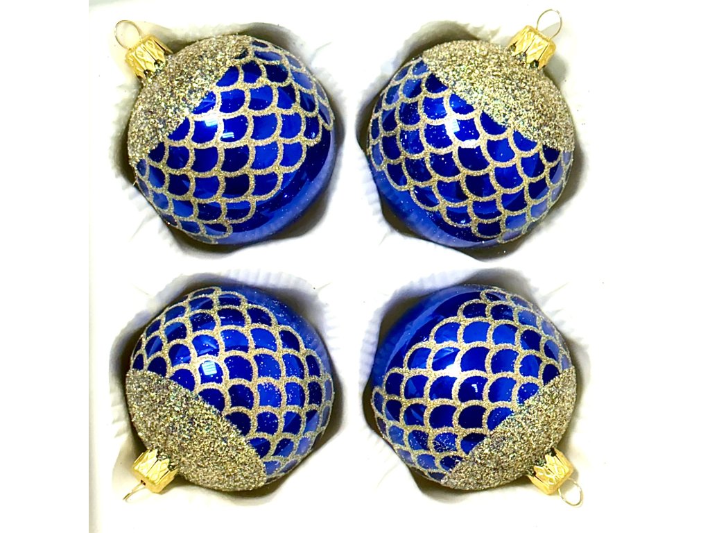 Skleněná vánoční koule Ø 7 cm – královsky modrá s třpytivou zlatou „šupinou“ (sada 4 ks) – IRISA Vsetín