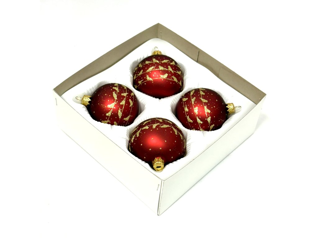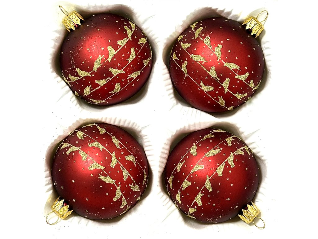 Skleněná vánoční koule Ø 7 cm – Matná červená se zlatými ptáčky (sada 4 ks)