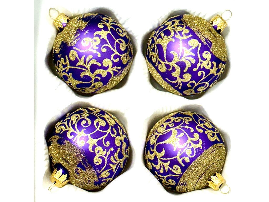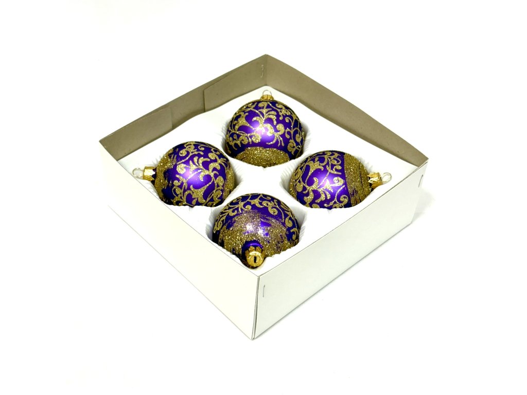 Vnáší do vašeho vánočního stromku noblesu a šarm tradiční české sklářské výroby. Každá koule je ručně vyfouknutá v beskydské sklárně IRISA, opatřená kovovým očkem se zlatým povrchem. Matný fialový lak kontrastuje s bohatým, vinutým ornamentálním vzorem z jemného zlatého glitru, který tvoří elegantní listové motivy a spirály.