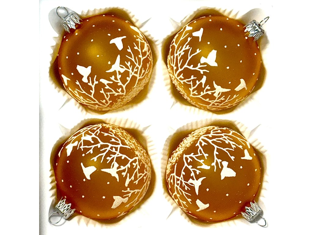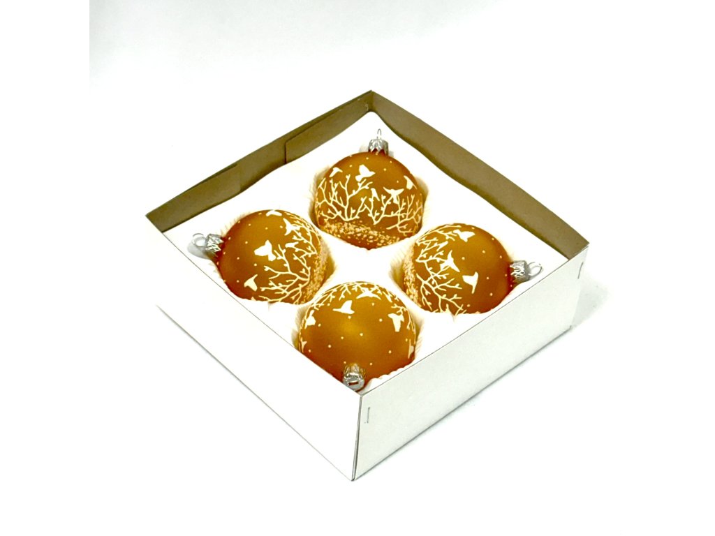 Skleněná vánoční koule Ø 7 cm – Medově jantarová s bílým zimním motivem (sada 4 ks)