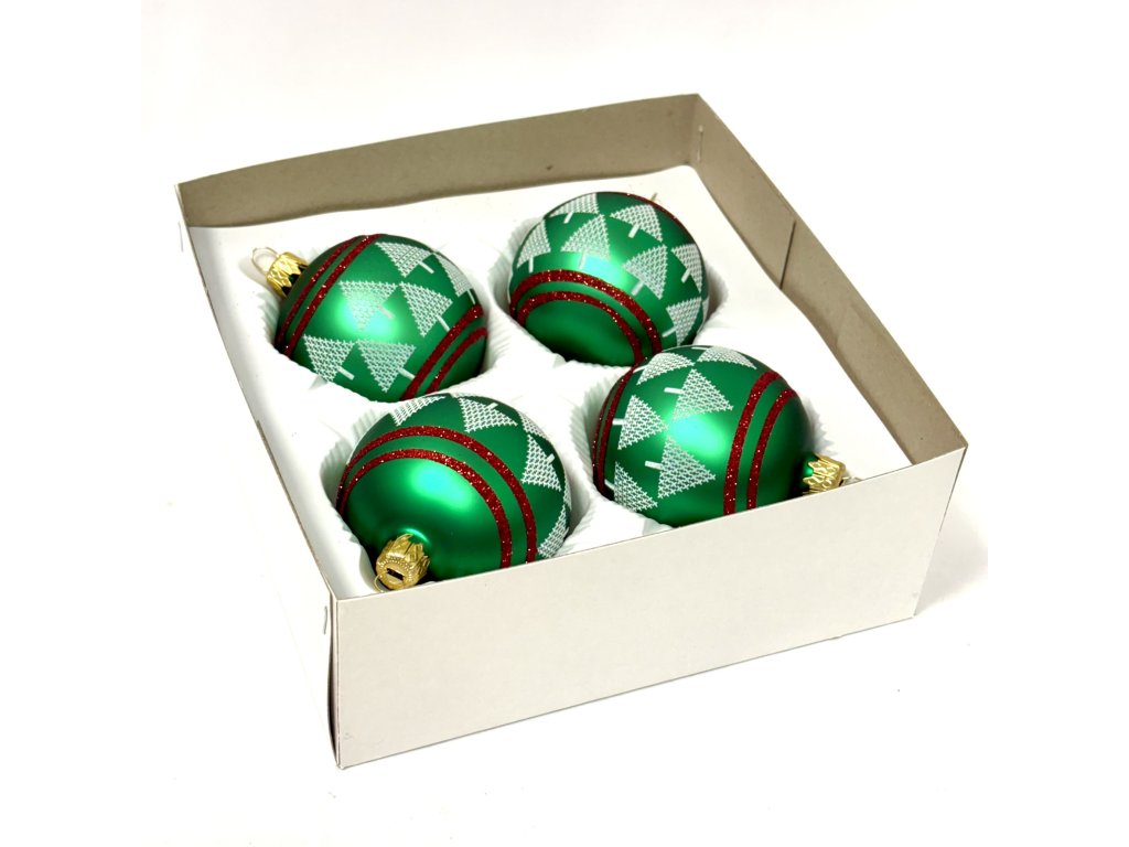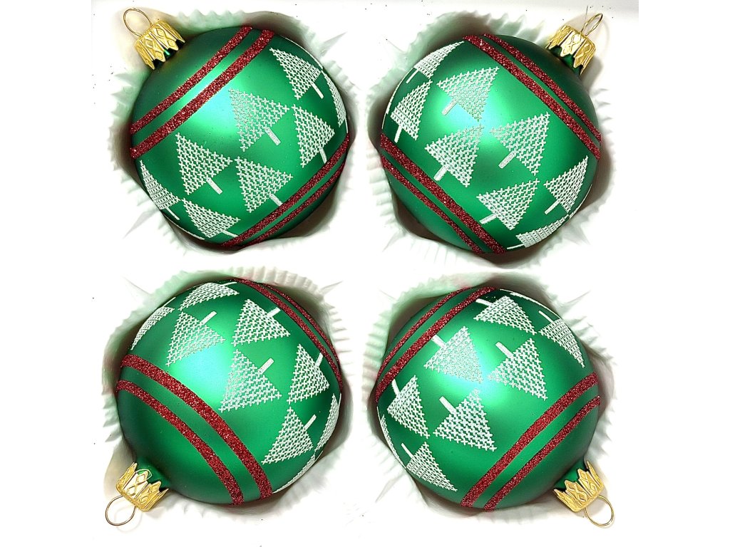 Skleněná vánoční koule Ø 7 cm – Nordic stromky & červený glitr (sada 4 ks)