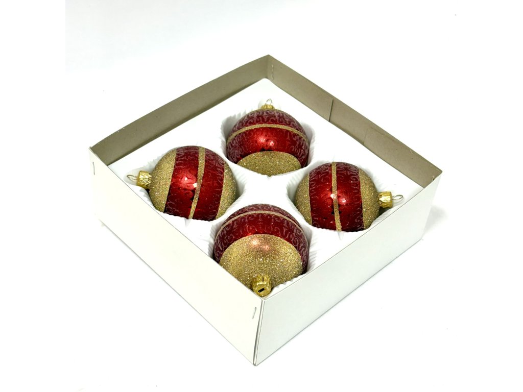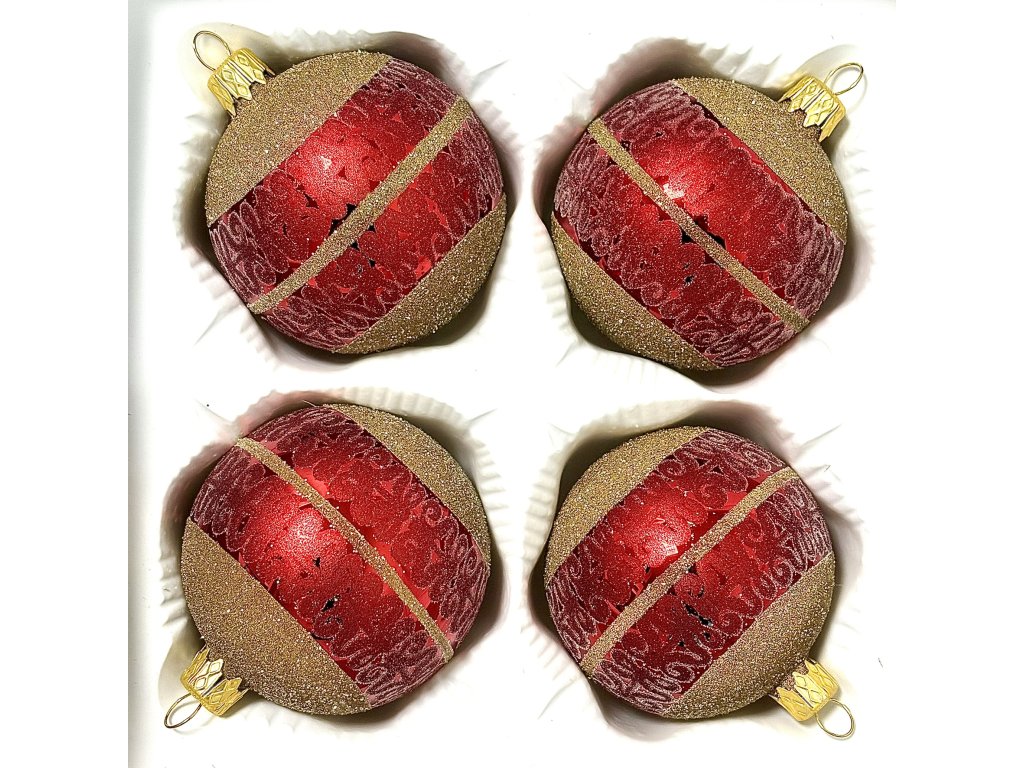 Skleněná vánoční koule Ø 7 cm – Rubínový samet & zlaté pruhy (sada 4 ks)