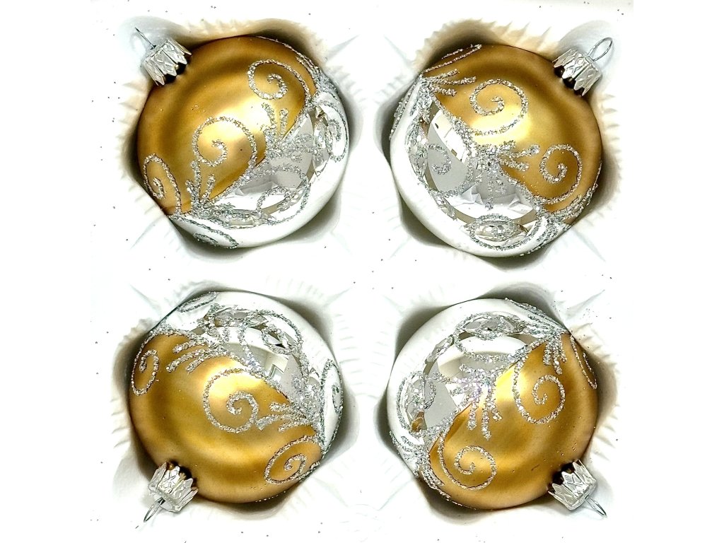 Dopřejte svému stromečku noblesní kontrast matu a lesku v luxusních zlatých tónech. Každá koule je ručně vyfoukaná ve vsetínské sklárně IRISA, poté získá sametově matný zlatý nástřik, na který navazuje vysoce leštěná stříbrná polovina. Stříbřité arabeskové spirály z jemného glitru obě plochy propojují a dodávají ozdobě jiskřivou hloubku.