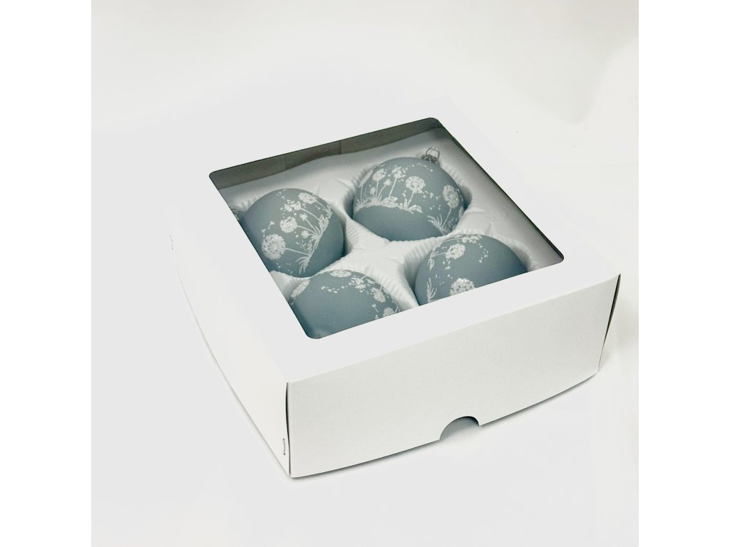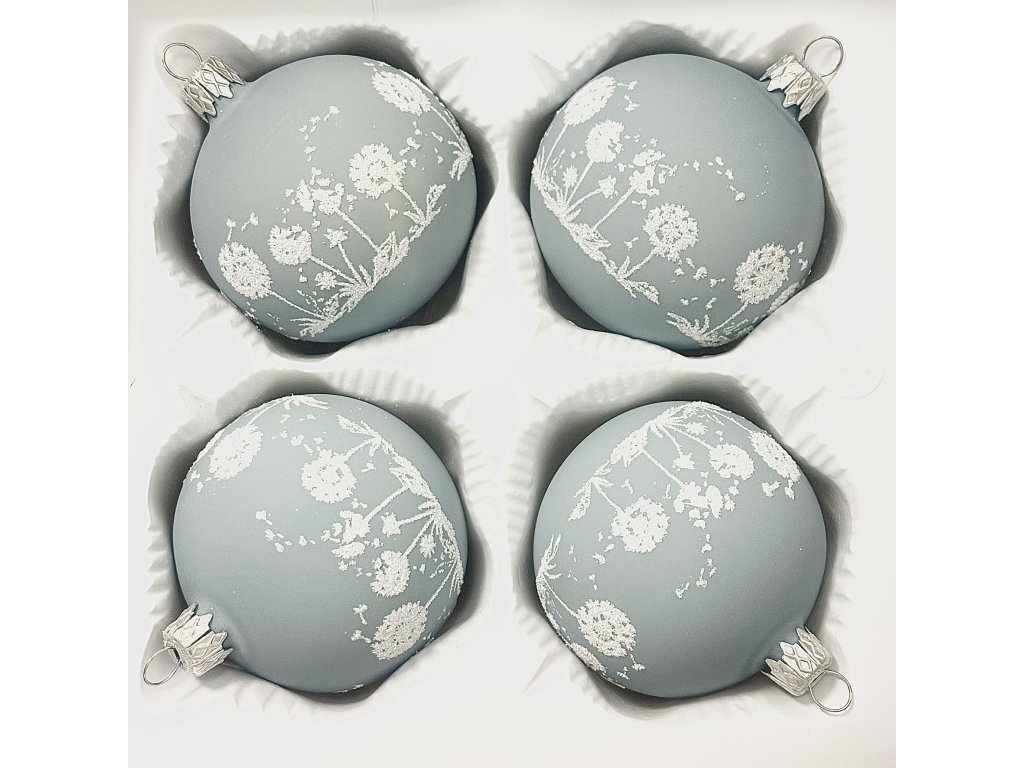 Tyto ručně foukané a malované vánoční koule v sobě spojují jemnost přírody a eleganci tradičního českého sklářství. Matná modrošedá barva působí moderně, přesto klidně a harmonicky, zatímco ručně malovaný motiv bílých pampelišek dodává celé sadě poetický a zasněný vzhled. Každá koule je originál, vytvořený s důrazem na detail a kvalitu. Třpytivý dekór pampeliškových květů symbolizuje křehkost zimní přírody a přináší do interiéru lehkost a vzdušnost. Tato sada čtyř koulí o průměru 7 cm je ideální pro kombinaci s bílými, stříbrnými nebo přírodními ozdobami. Skvěle se hodí nejen na vánoční stromeček, ale i jako vkusná dekorace do vázy nebo na sváteční stůl.Doplňkové parametry