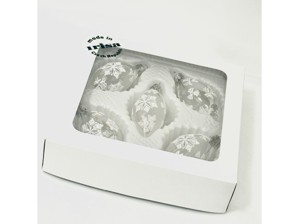 Tato originální sada pěti ručně foukaných skleněných oliv přináší na vánoční stromeček kouzlo zimní čistoty a nostalgického šarmu. Každá ozdoba je vyrobena z čirého skla a zdobena ručně malovaným dekorem bílých vloček, který vytváří dojem jemného mrazu. Zajímavý olivový tvar dodává ozdobám retro nádech, který připomíná tradiční vánoční výzdobu z minulých let. V kombinaci s průhledným sklem působí ozdoby lehce, elegantně a přitom slavnostně. Skleněné olivy jsou ideální pro kombinaci s klasickými koulemi, rampouchy nebo špicemi v bílé, stříbrné či přírodní barevnosti. Každý kus je poctivým výsledkem ruční práce českých sklářů, kteří spojují tradici s precizností a citem pro detail.Doplňkové parametry
