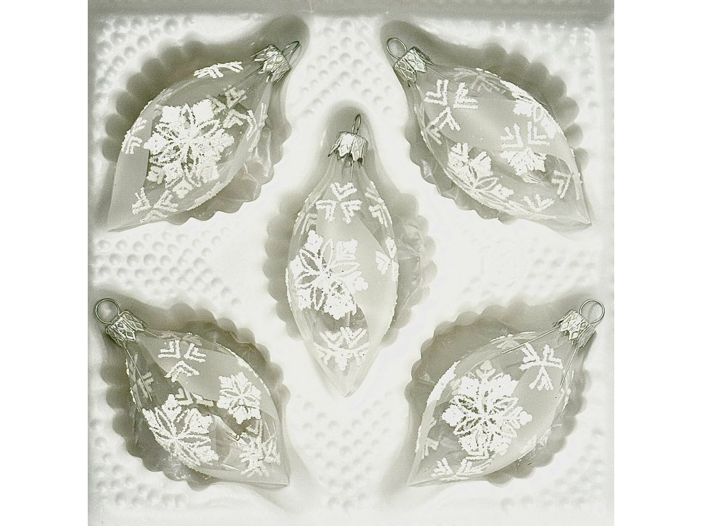 Skleněné vánoční olivy 6 cm – Čiré s bílými vločkami (sada 5 ks)