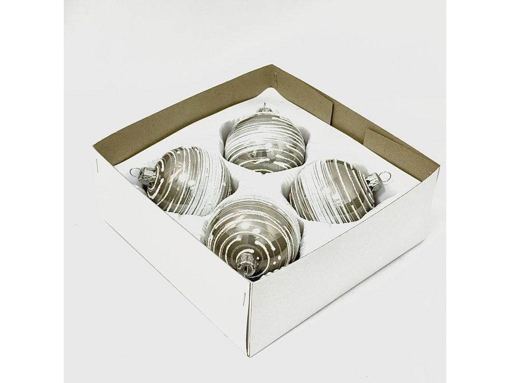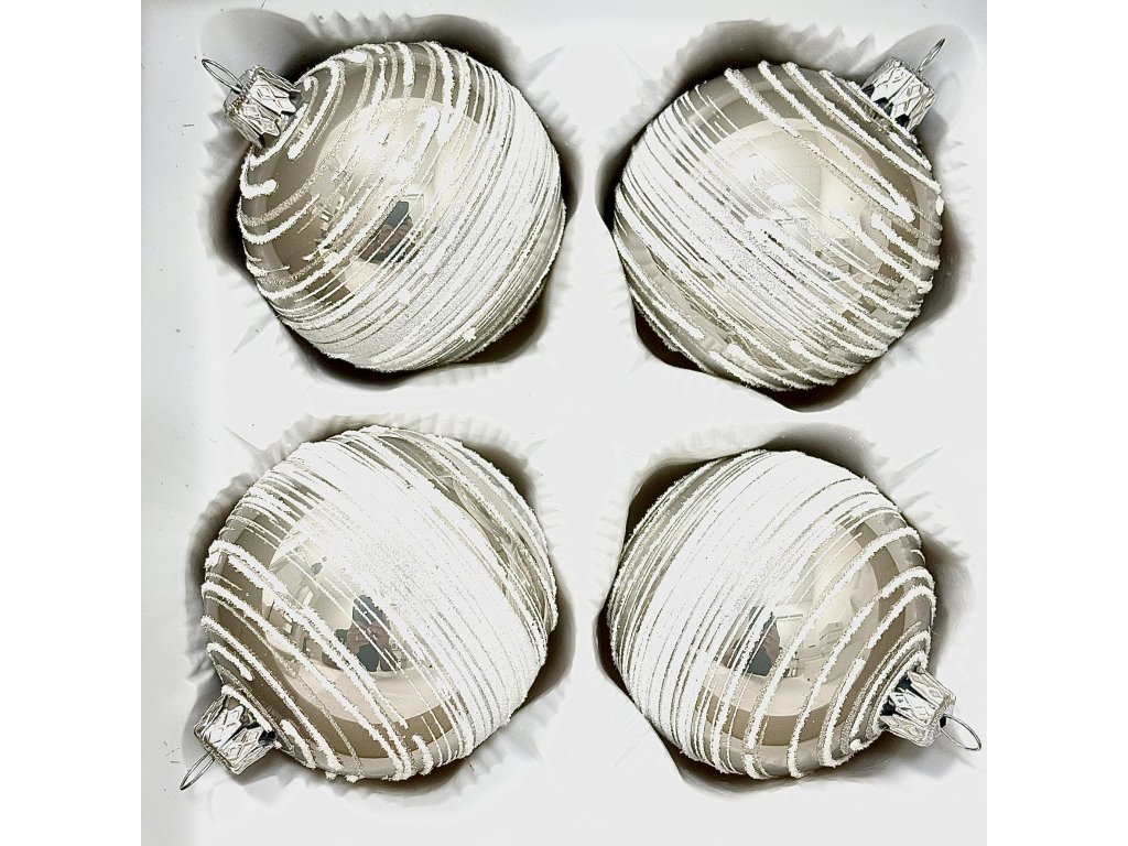 Vneste na svůj vánoční stromek křišťálově čistou zimní atmosféru. Sada čtyř stříbrných skleněných koulí (ø 7 cm) zaujme jemným zrcadlovým leskem a nepravidelnými bílými tahy, jež evokují sněhové víry na zamrzlém jezeře. Ozdoby jsou ručně foukané z českého skla a dekorované kombinací matného a lesklého povrchu, díky čemuž krásně odrážejí světla svíček i řetězů. Každý kus vzniká v dílně Irisa Vsetín – tradičním českém výrobci skleněných vánočních ozdob. Dodáváno v ochranné krabičce, ideální také jako reprezentativní dárek.