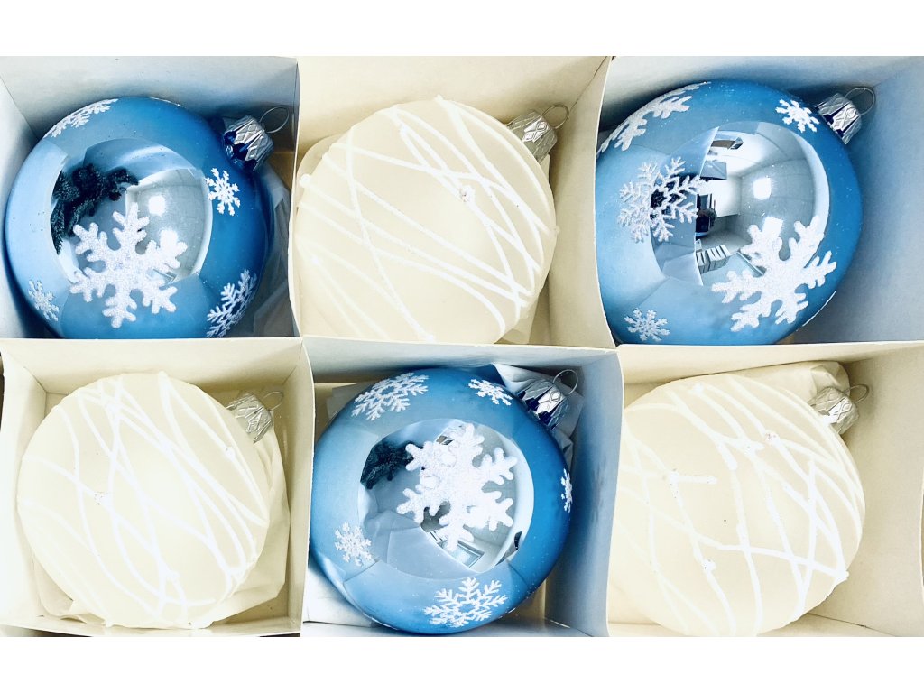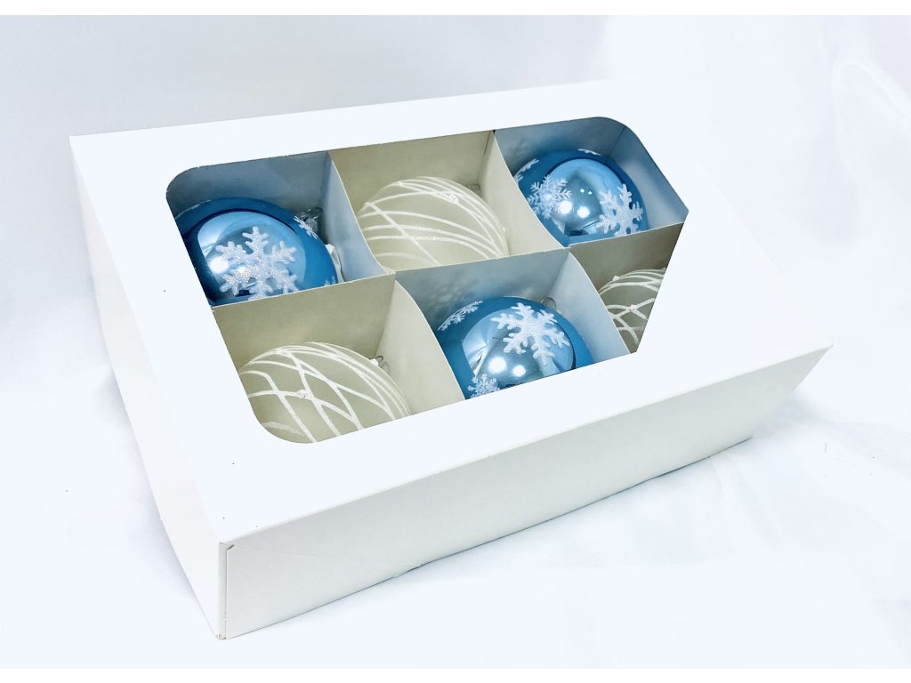 Bílé a modré barvy ozdob přinášejí do vánoční dekorace svěžest a lehkost. Velikost ozdob 8 cm je dostatečně výrazná, aby ozdobil váš stromek či jinou dekorativní část interiéru. Tato sada je jako hravý taneček větru, který přinese do vašeho domova energii a radost vánočního období.