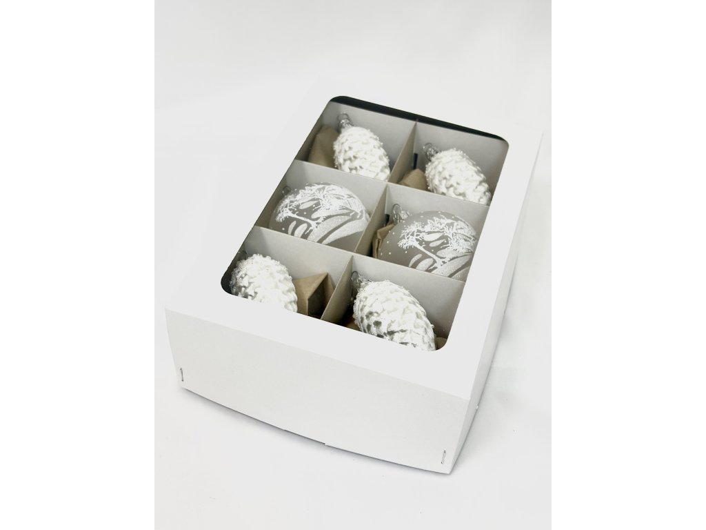 Bílé skleněné koule a šišky 7 cm – zimní krajina ( sada 6 ks )