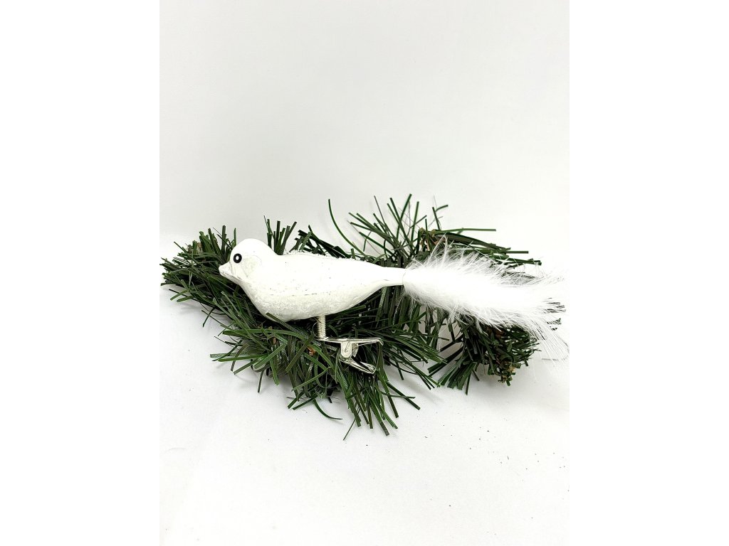 Ručně vyráběný bílý skleněný ptáček s jemným třpytem a bílým peříčkem, délka 10 cm, uchycení na klips. Vyrobeno v České republice Firma s tradicí od roku...