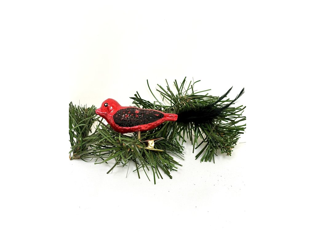Ručně vyráběný červený skleněný ptáček s bohatým třpytem a dlouhým červeným peříčkem, délka 10 cm, uchycení na klips. Vyrobeno v České republice Firma...