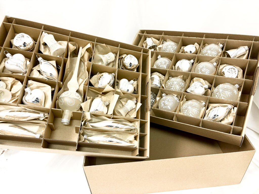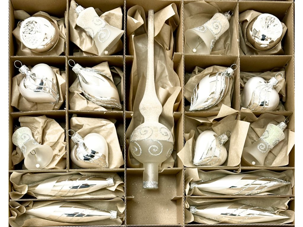 Tato luxusní sada 37 kusů skleněných vánočních ozdob s elegantní stříbrnou špicí představuje dokonalou souhru tradice a stylu. Každý kus je ručně foukaný a malovaný v dílnách Irisa Vsetín, kde se poctivé řemeslo předává z generace na generaci. Bílo-stříbrná kombinace přináší do interiéru dojem čistoty, sněhové jemnosti a svátečního klidu. V sadě najdete koule s vločkami a srdíčky, zvonečky, olivy i rampouchy, které dohromady vytvářejí dokonale sladěný celek. Každá ozdoba je originál, zdobený ručně nanášeným glitrem a stříbrnými liniemi. Tato sada je ideální pro střední až větší stromek a vytvoří nezapomenutelnou atmosféru elegantních českých Vánoc. Luxusní balení zároveň chrání ozdoby a umožňuje jejich bezpečné uchování po mnoho let. Vykouzlete si jedinečnou vánoční atmosféru s českými skleněnými ozdobami Irisa.