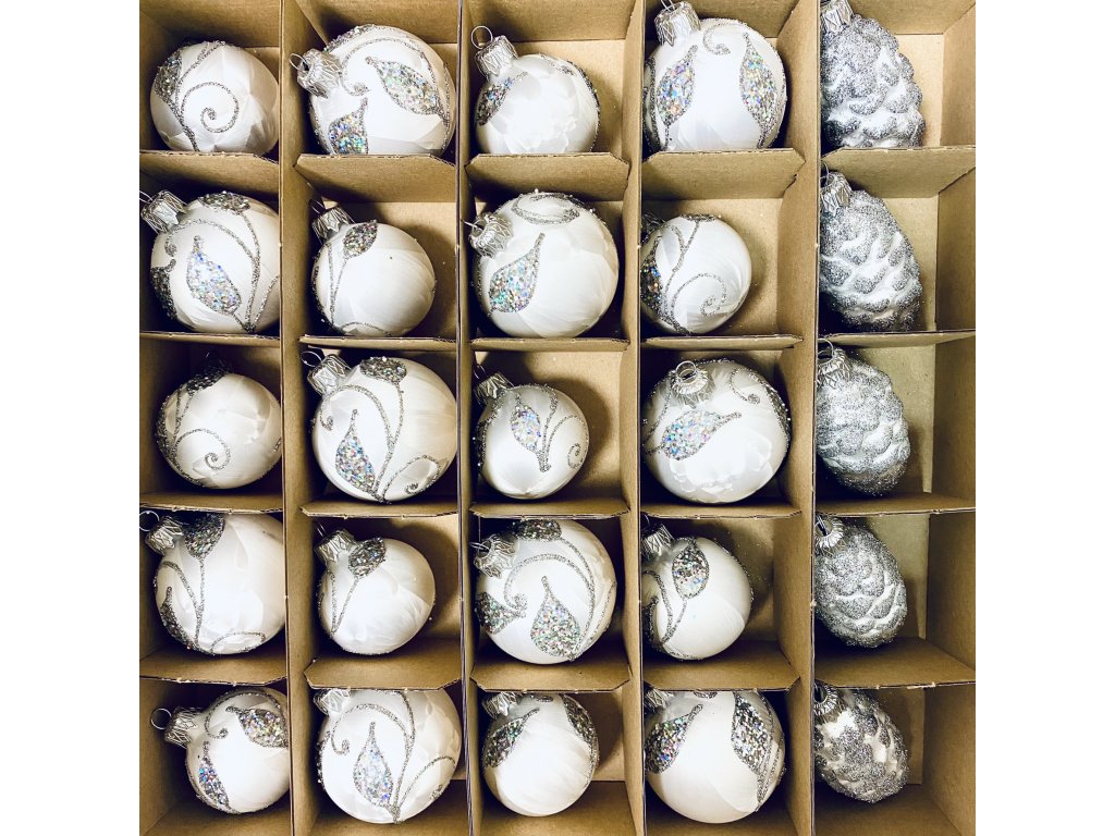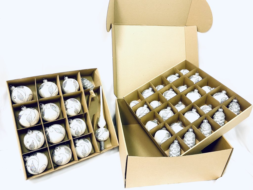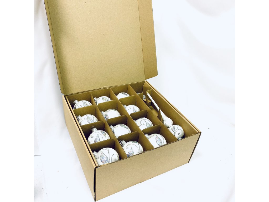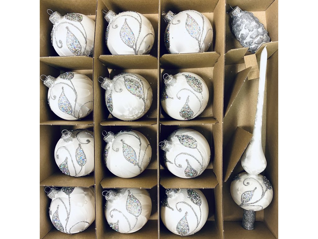 Irisa LUXUSNÍ SET Vánoční ozdoby ANITA - bílé dekor větvičky , BOX 39 ks. Získáte designovou kolekci ozdob se kterou ozdobíte středně velký strom. Skleněné ozdoby se vám tak...