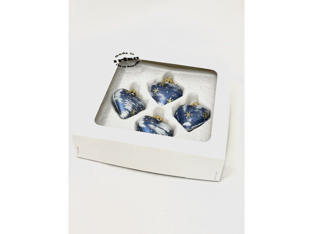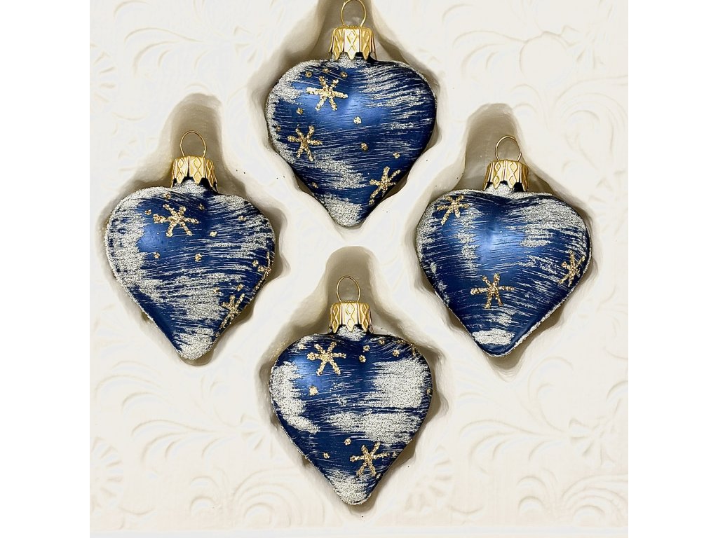 Dodejte svému vánočnímu stromku jedinečný šmrnc s tímto setem čtyř ručně foukaných a malovaných skleněných srdíček o velikosti 7 cm. Modrý podklad zdobený stříbrnými tahy a jemnými zlatými hvězdami působí slavnostně a elegantně zároveň. Ozdoby jsou vyrobeny tradičním českým sklářským řemeslem a díky své originalitě vnesou do vašeho domova kouzelnou zimní atmosféru. Set je balen v dárkové krabičce a je tak i krásným tipem na vánoční dárek.Doplňkové parametry