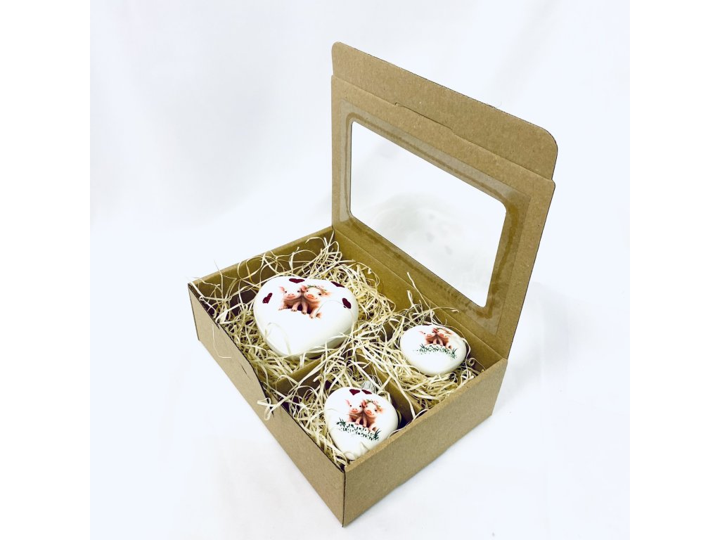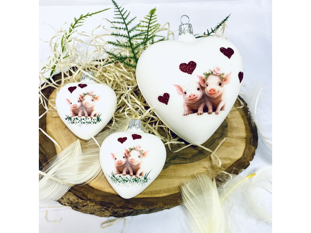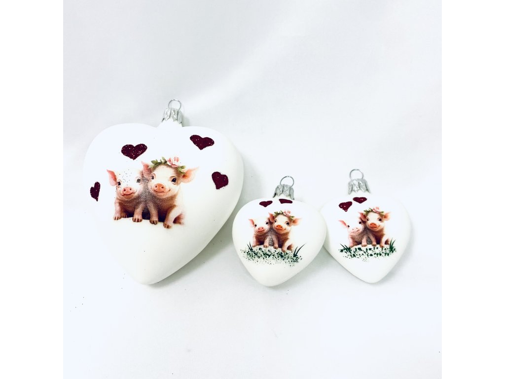 IRISA Sada skleněných srdcí s dekorem veselé prasátka – 3ks, 7 c a 13 cm, bílé