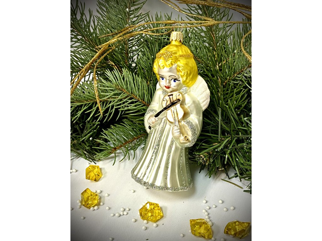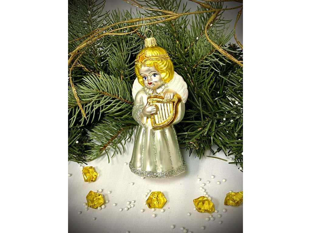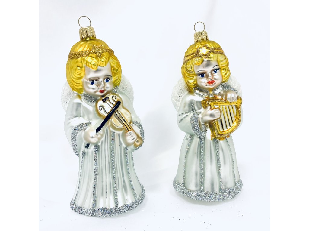 Irisa Skleněná vánoční ozdoba ANDĚL S HARFOU A S HOUSLEMI velikost 12 cm sada 2 ks