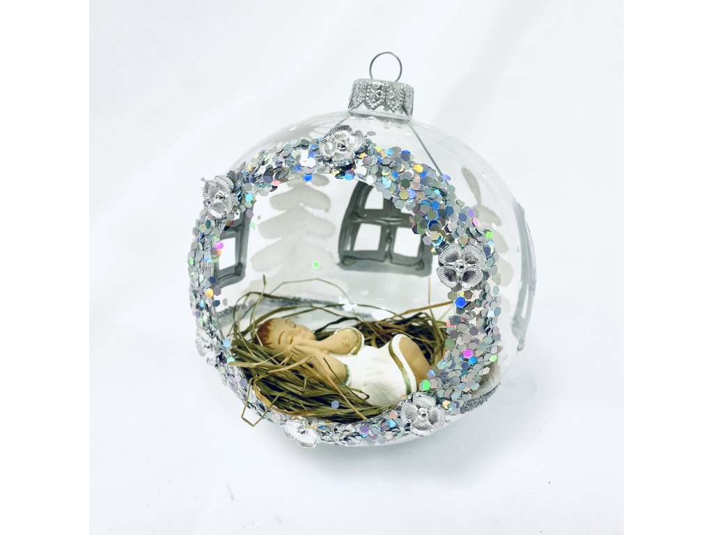 Irisa Vánoční exkluzivní ozdoba čirá JEŽÍŠEK V SENĚ dekor stříbrná velikost 12 cm