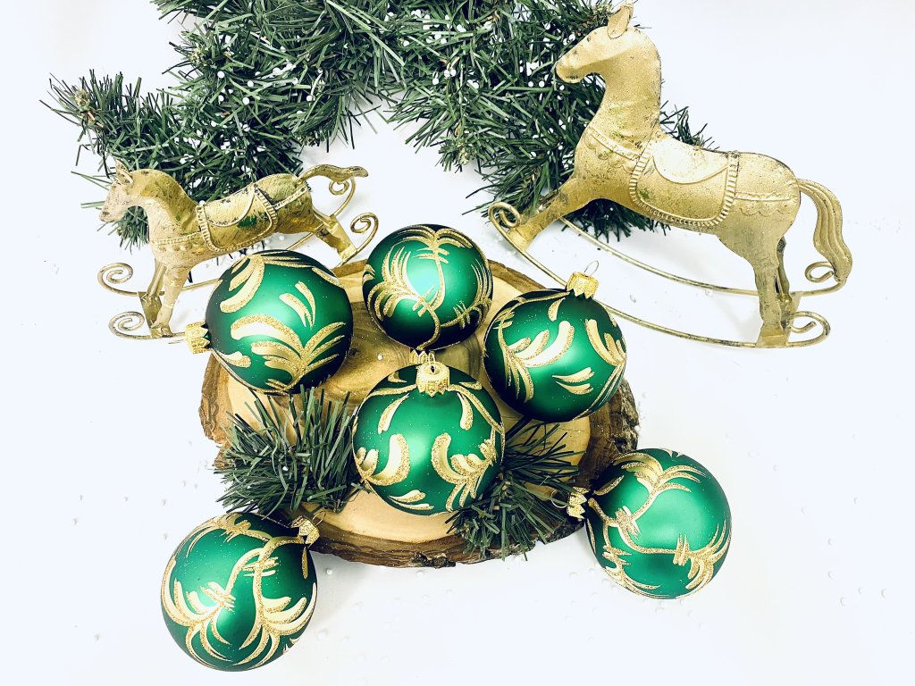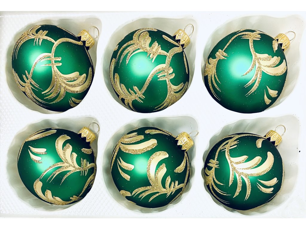 Irisa Vánoční exkluzivní ozdoby GABRIELA zelené koule dekor lístky Velikost 7 cm, SET 6 ks