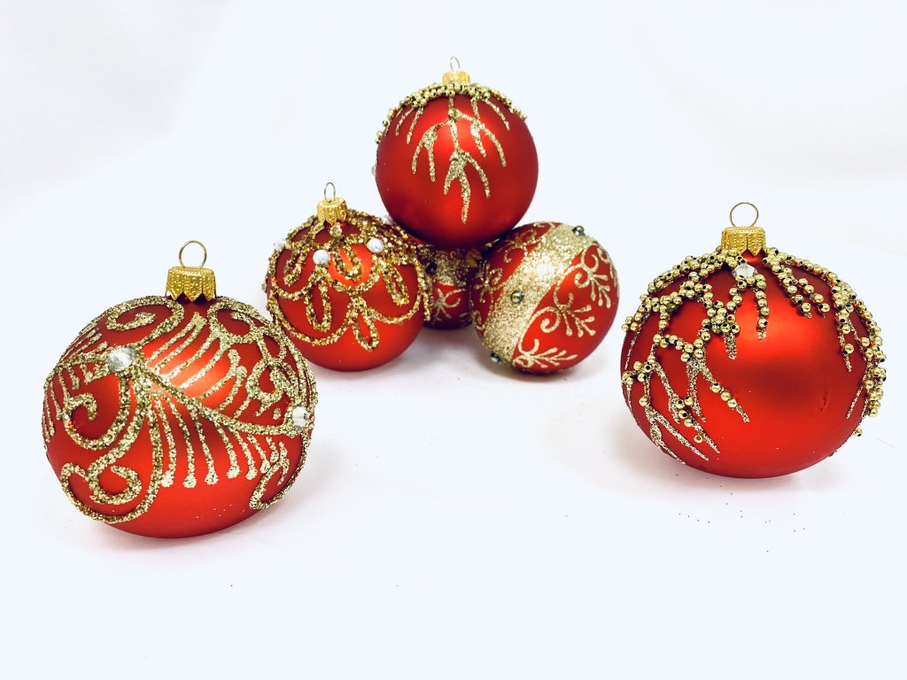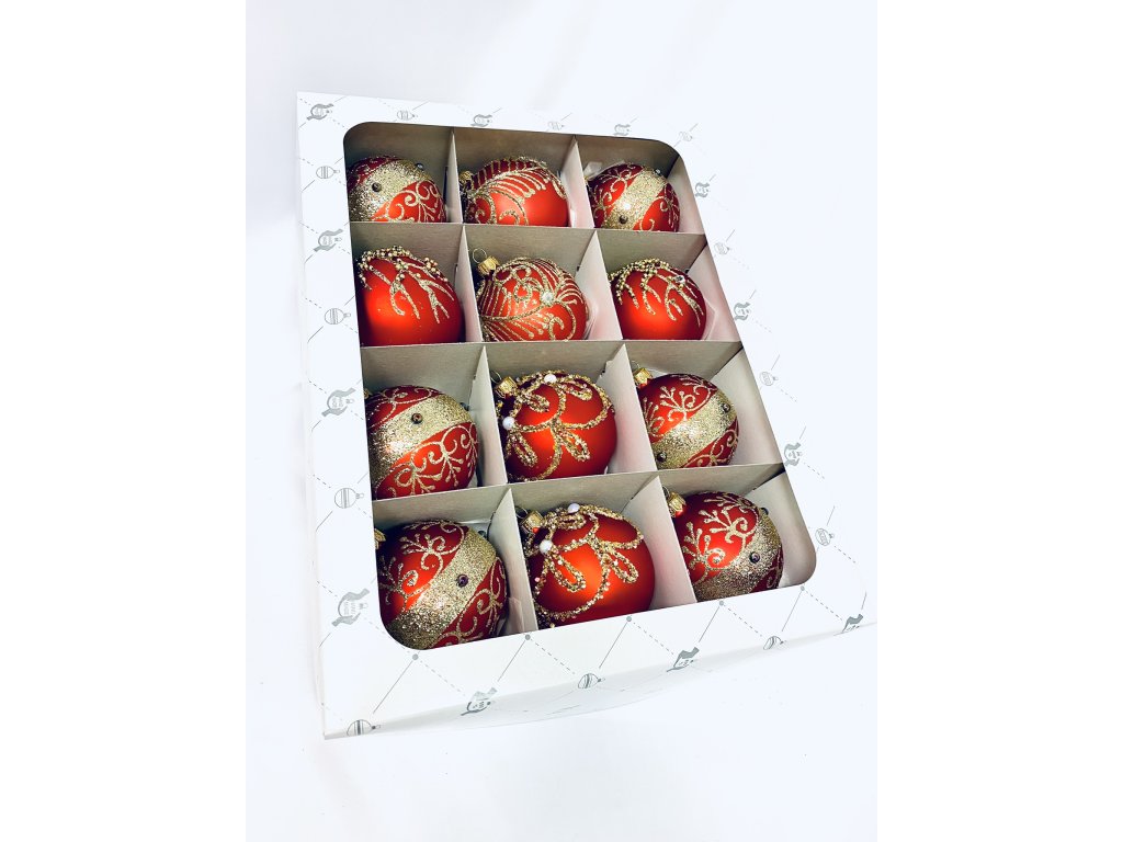 Irisa Vánoční exkluzivní ozdoby KRISTA červené koule se zlatým dekorem Velikost 8 cm, SET 12 ks