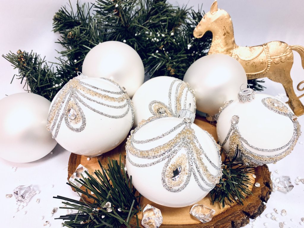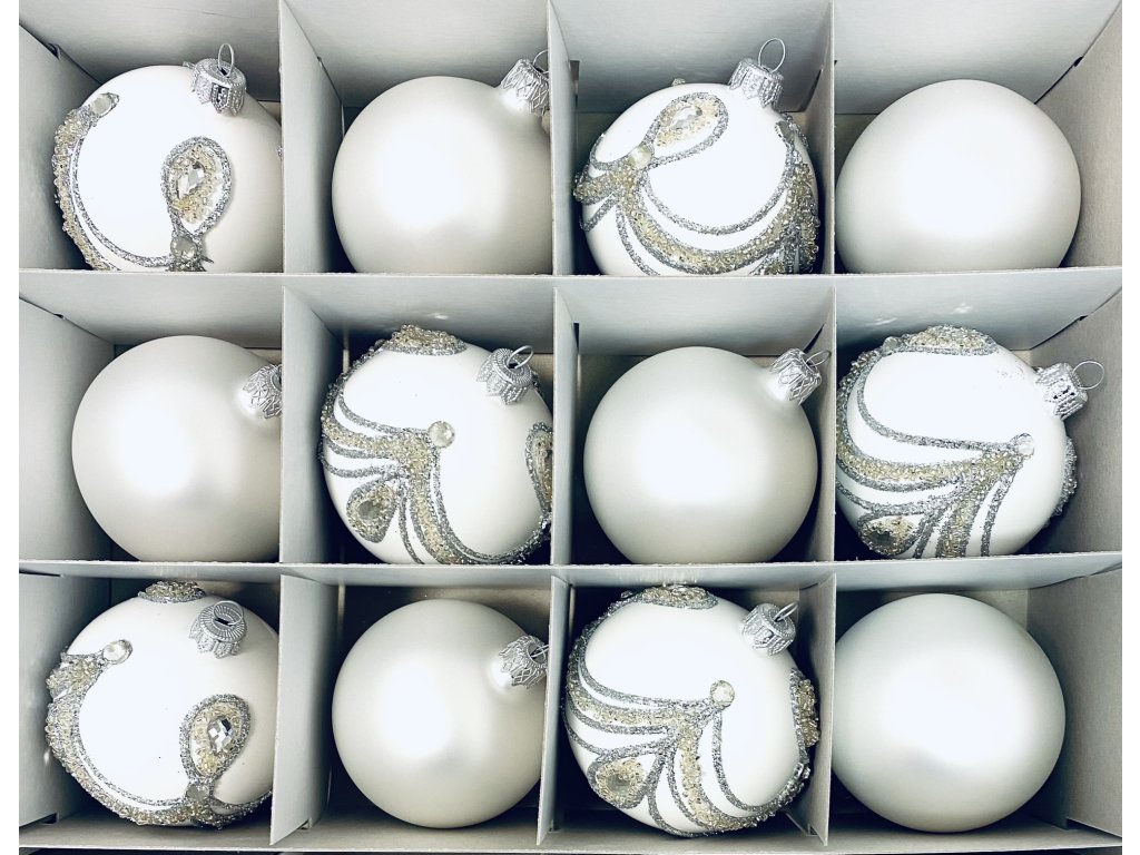 Irisa Vánoční exkluzivní ozdoby NIKA bílé koule kombinace s dekorem závěs Velikost 8 cm, SET 12 ks
