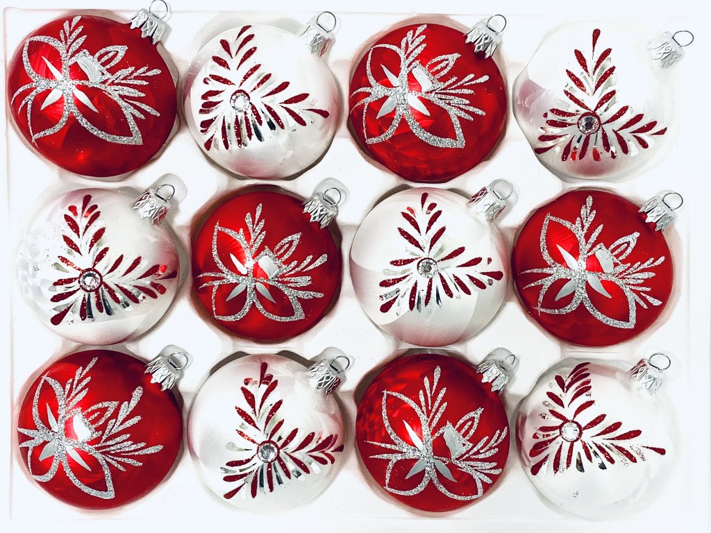 Irisa Vánoční ozdoby LIANA kombinace bílé a červené koule s dekorem mrazolak 7 cm, SET 12 ks