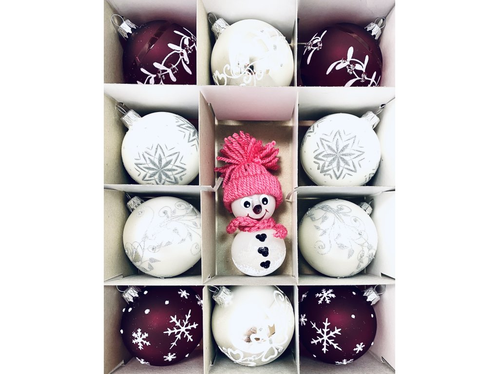 Vykouzlete si jedinečnou vánoční atmosféru s českými skleněnými ozdobami Irisa. 6x bílá koule s dekorem zimního mrazu: Tyto elegantní bílé koule jsou zdobeny jemným dekorem, který připomíná krásu zamrzlých okenních tabulek a jemnost sněhových vloček, které pokrývají krajinu. 4x fialové koule s dekorem zimní krajiny: Sytě fialové koule s motivy zasněžených stromů a mrazivých večerů dodají Vašemu vánočnímu stromku teplé a veselé tóny, které oživí každou domácnost. 1x figurka sněhuláka s růžovou čepicí a šálou: Roztomilý sněhulák s růžovou čepicí a šálou přináší radost a veselí do každého domova. Jeho usměvavý obličej a hravé barvy jsou perfektním doplňkem této sady.