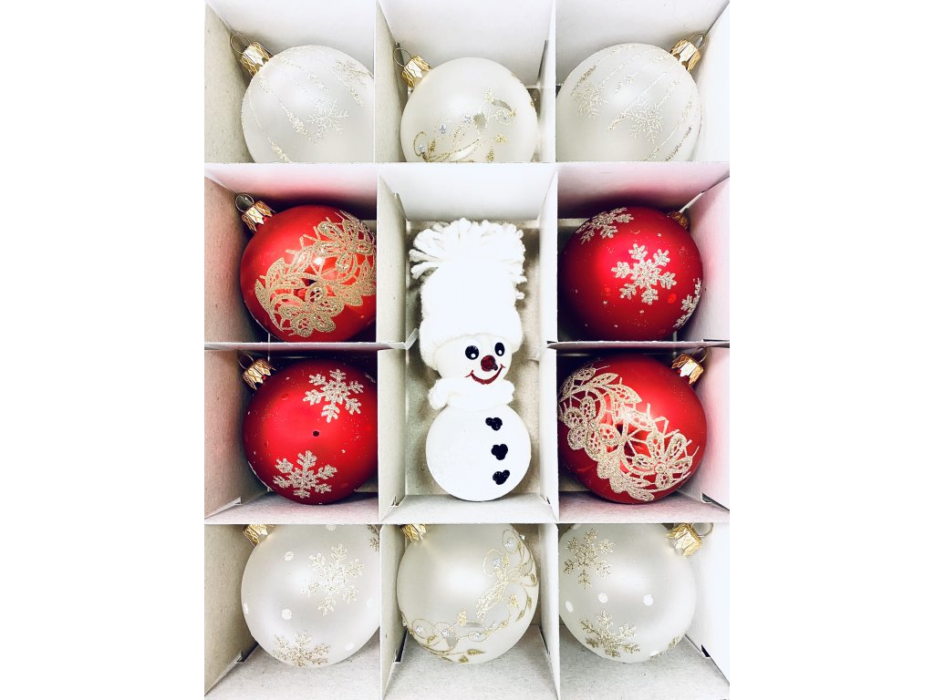 Vykouzlete si jedinečnou vánoční atmosféru s českými skleněnými ozdobami Irisa. 4x červená ozdoba se zlatým dekorem: Tyto červené koule jsou zdobeny zlatými vzory, které připomínají zlaté větvičky a přinášejí do vašeho interiéru teplý a vánoční pocit. 6x bílá ozdoba s dekorem zlatých větviček: Bílé koule jsou zdobeny jemnými zlatými větvičkami, které symbolizují klid a eleganci zimní krajiny. Tento design přidává vánočnímu stromku nádech svátečnosti a záře. 1x bílý sněhulák s bílou čepicí a šálou: Tento roztomilý sněhulák je ozdobou, která dodá vaší vánoční výzdobě hravost a radost. Má na sobě bílou čepici a šálu, které ladí s ostatními ozdobami sady.