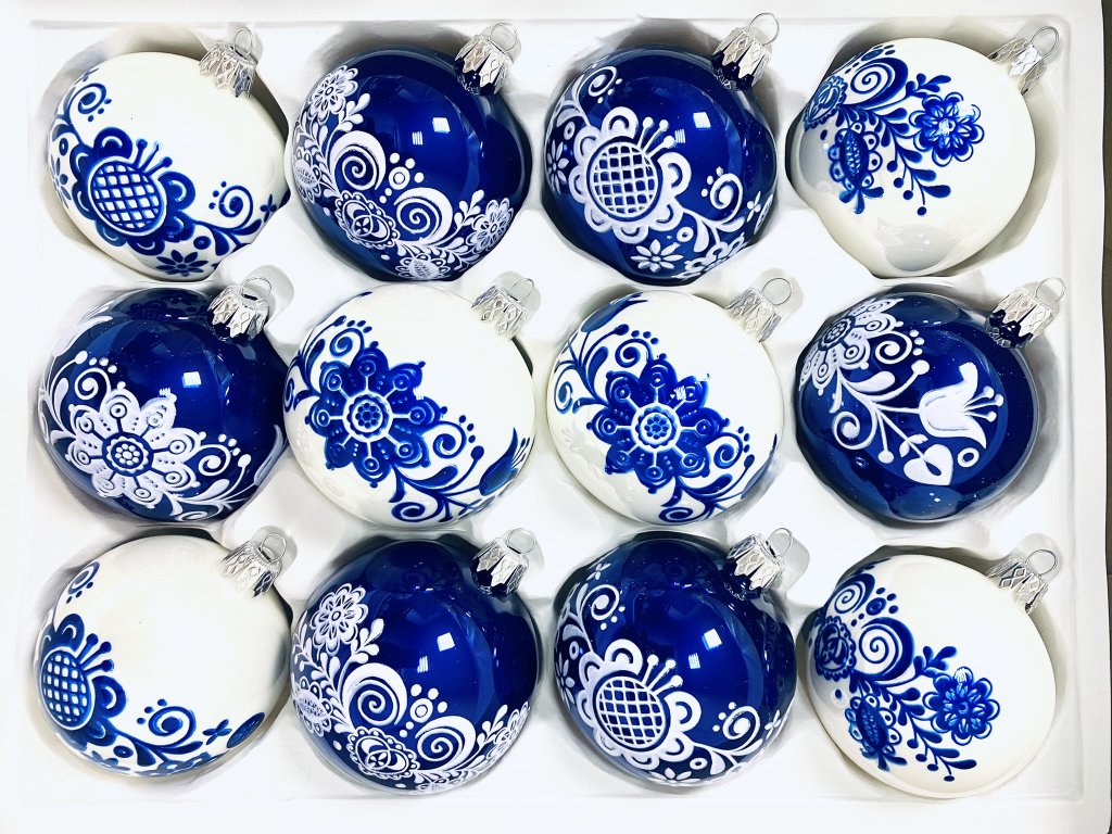 Irisa Vánoční skleněná sada ZDISLAVA kombinace bílé a modré koule s dekorem folklor 7 cm, SET 12 ks