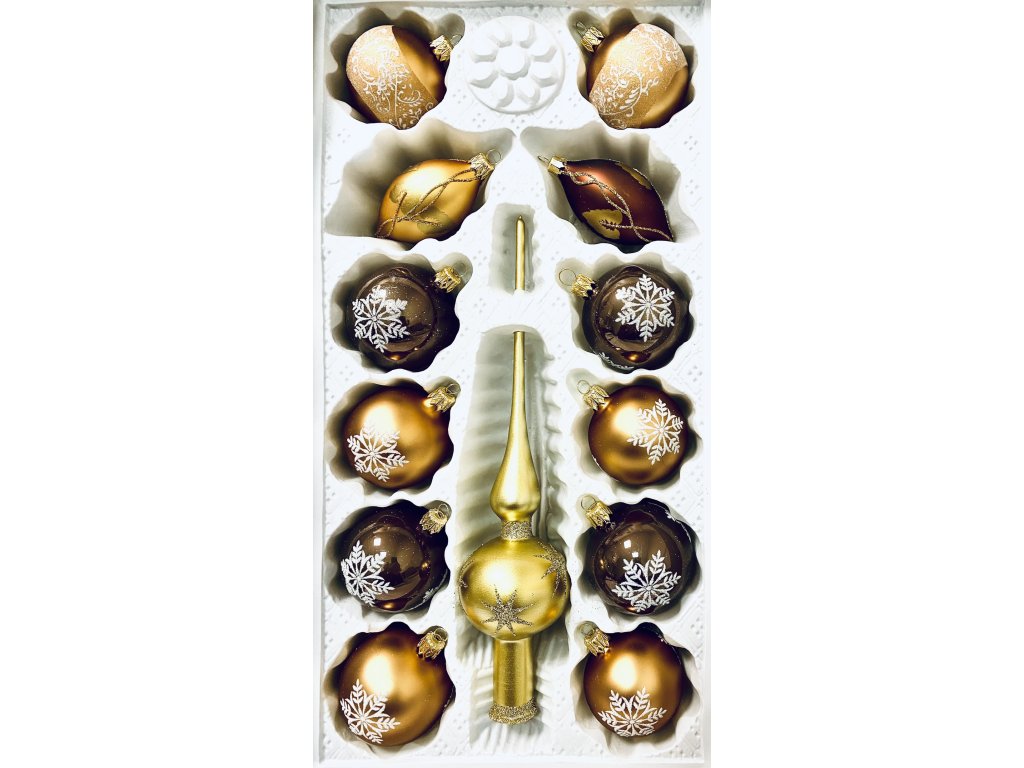 Irisa Zimní pohádka - kolekce Zlatého lesa: zlatá špice a koule plné vloček - hnědé,zlaté , 13 ks