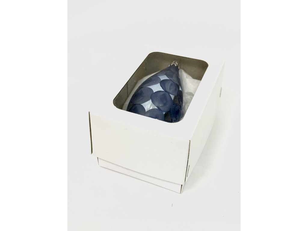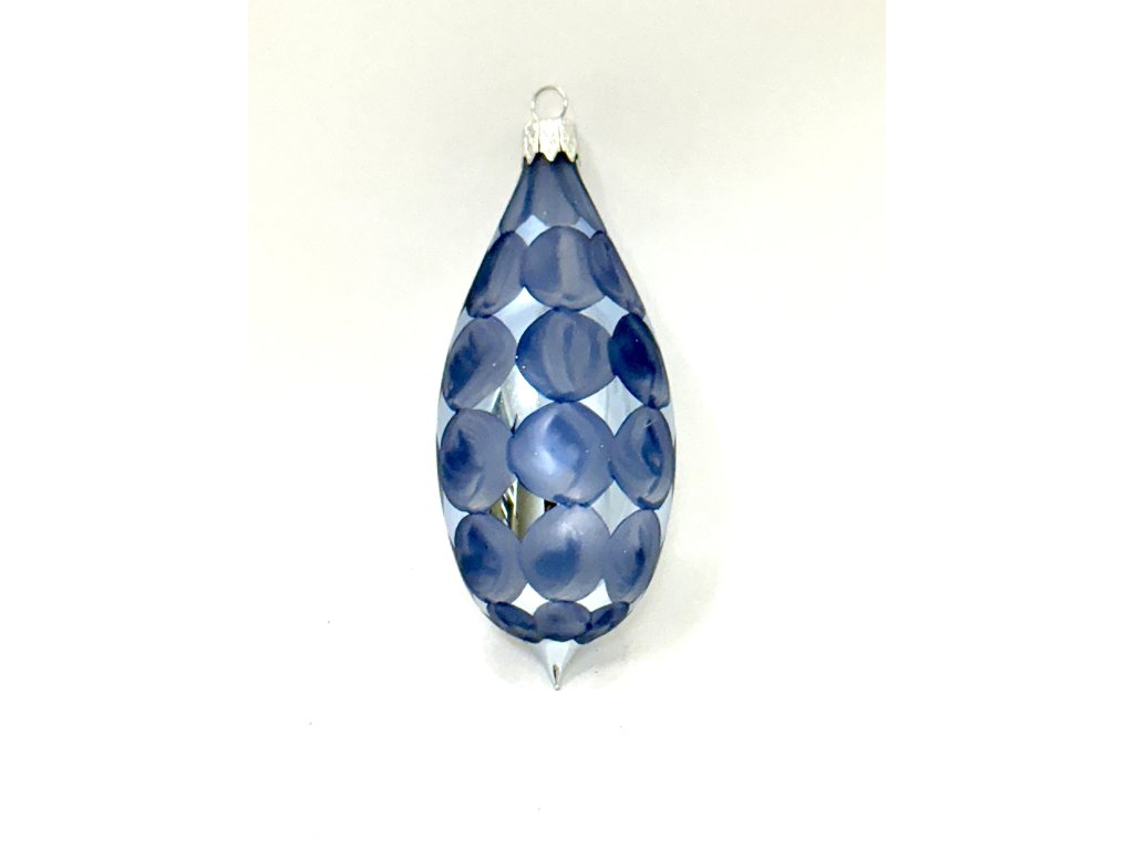 Představujeme jedinečný, ručně foukaný skleněný ornament ve tvaru kapky o délce 10 cm. Jeho hladký, průhledný podklad zdobí vrstvené, saténově matné kruhy v elegantní modré barvě, pečlivě nanášené štětcem pro hravý reliéfní efekt. Každý prvek ornamentu je originál – od tvaru po rozmístění kruhů – což zaručuje, že vlastník získá zcela výjimečný doplněk. Ornament je opatřen kovovou závěsnou úchytkou a dodáván v ochranném kartonovém balení. Skvěle se hodí jako stylový detail na vánoční stromeček, borovicovou větvičku i jako dekorační prvek v zimní aranžmá.