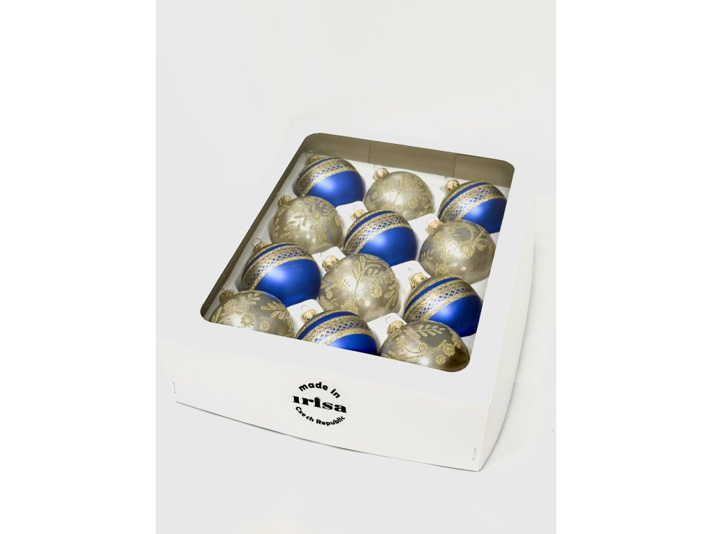 Spojení syté královské modři a elegantního zlata působí na vánočním stromečku noblesně a slavnostně. Tato sada 12 skleněných koulí o průměru 7 cm nabízí kombinaci dvou vzorů – hladkého zlatého povrchu se zlatým květinovým dekorem a výrazné modré se zlatými ornamentálními pásy. Každý kus je ručně foukaný a zdobený v české dílně Irisa Vsetín, kde se tradice sklářského řemesla předává z generace na generaci. Tyto ozdoby dodají stromečku výjimečný lesk, pocit luxusu a sváteční kouzlo, které uchvátí na první pohled.Doplňkové parametry