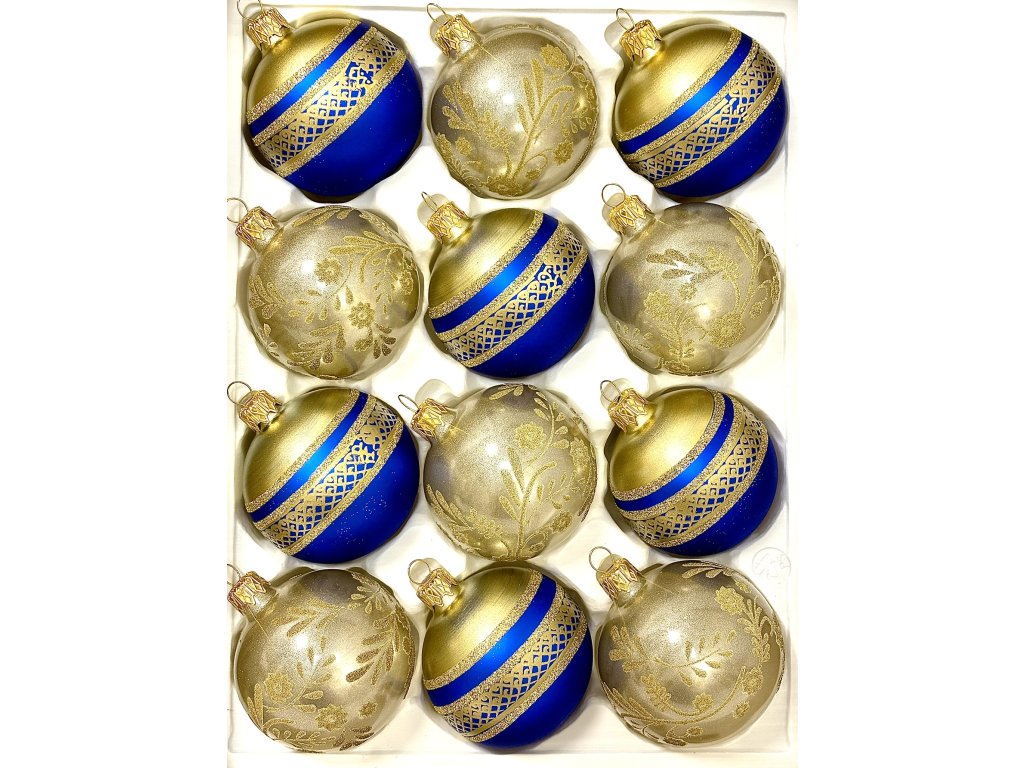 Královská modro-zlatá – sada 12 skleněných vánočních koulí 7 cm s ornamenty