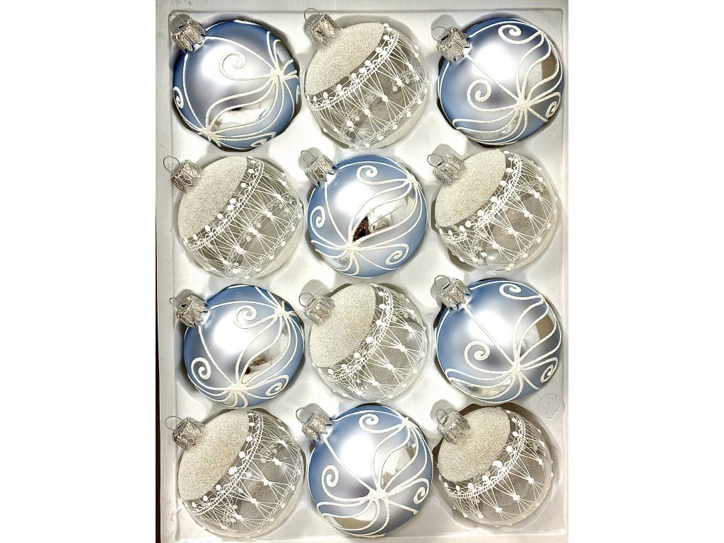 Tato sada 12 skleněných vánočních ozdob velikosti 7 cm představuje dokonalou souhru elegance a zimní něžnosti. Ozdoby v matně modrém a stříbrném provedení jsou zdobeny ruční malbou v podobě jemných bílých ornamentů a krajkových detailů, které působí jako zamrzlé vzory na okně. Transparentní koule s perleťově bílým posypem vytvářejí efekt ledových vloček, zatímco modré koule s bílými křivkami dodávají stromečku moderní a slavnostní vzhled. Každý kus je originálním kouskem tradiční české sklářské výroby, který rozzáří váš domov a vnese do něj kouzlo zimní pohádky. Tyto foukané skleněné ozdoby jsou ideální volbou pro milovníky luxusního, ale zároveň něžného vánočního stylu.Doplňkové parametry