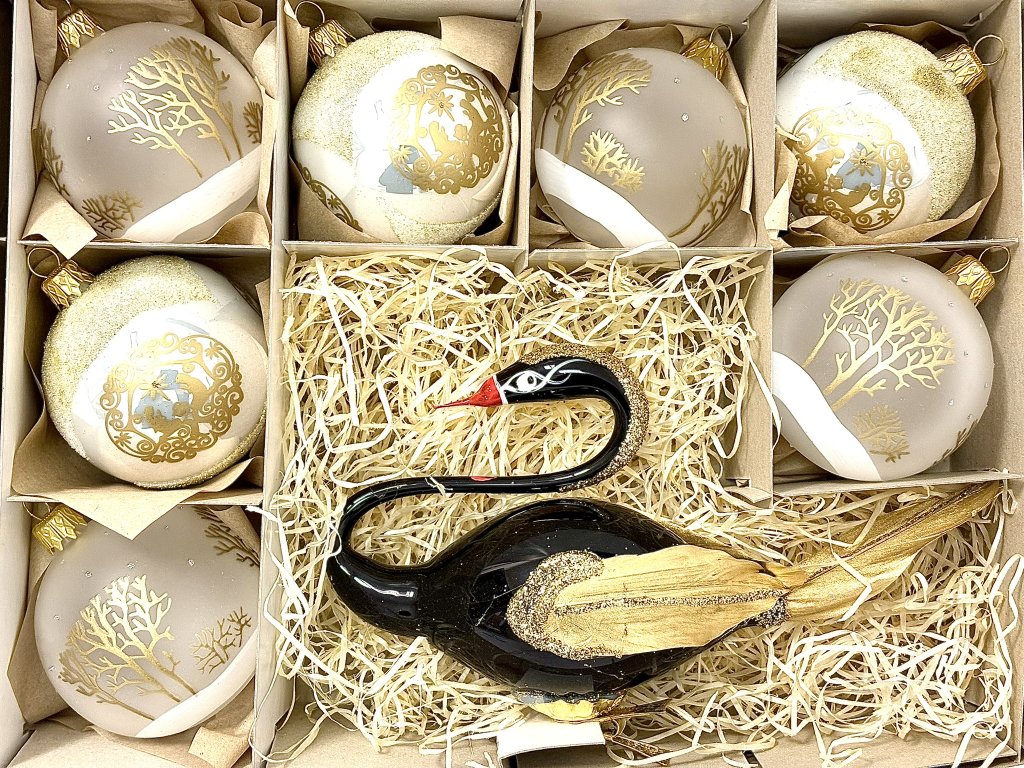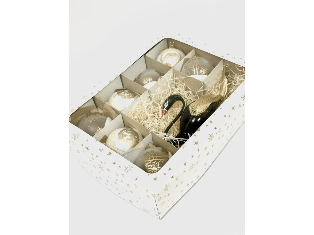 Tato unikátní sada spojuje jemnost ručně foukaných koulí se zlatým dekorem a dramatickou krásu černé labutě. Sedm koulí o průměru 7 cm zdobí ručně malované motivy zlatých větví a ornamentálních rámů, které vytvářejí dojem zimní pohádky a zároveň luxusního vintage stylu. Dominantním prvkem celé kolekce je ručně malovaná černá labuť s elegantním zlatým ocasem a červeným zobákem – symbol elegance, věrnosti a klidné síly. Její lesklé tělo kontrastuje se zlatobílými koulemi a dodává celé sadě umělecký charakter. Každá ozdoba je originálním dílem českých sklářů z dílny Irisa Vsetín, kteří s precizností a citem pro detail uchovávají tradici ruční výroby vánočních ozdob. Tato sada přinese vašemu stromku výjimečný lesk, eleganci i příběh českého řemesla.
