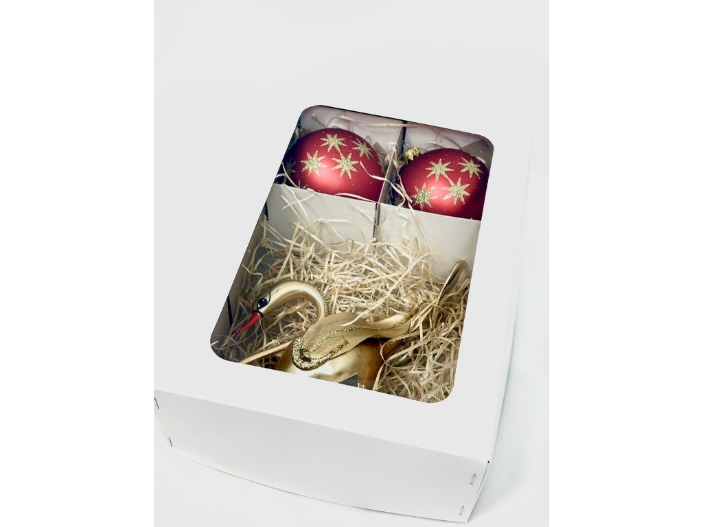 Tato vánoční sada zaujme svým noblesním kontrastem červené a zlaté – kombinace, která odjakživa symbolizuje teplo Vánoc, radost a slavnostní atmosféru. Dvě matné červené koule zdobí třpytivé zlaté hvězdy, které připomínají záři vánoční oblohy. Dominantou celé sady je ručně foukaná zlatá labuť s precizně malovaným zobákem a křídly posypanými jemným třpytem. Její ladné linie a zlatý lesk působí elegantně a přirozeně, díky čemuž se stane výjimečnou ozdobou stromku i interiéru. Každý kus pochází z české sklářské dílny Irisa Vsetín, kde se ruční výroba a umělecký cit spojují v originální vánoční dekorace. Sada je uložena v dárkové krabičce s přírodní výplní a představuje ideální dárek pro milovníky tradičních, ale luxusních Vánoc.