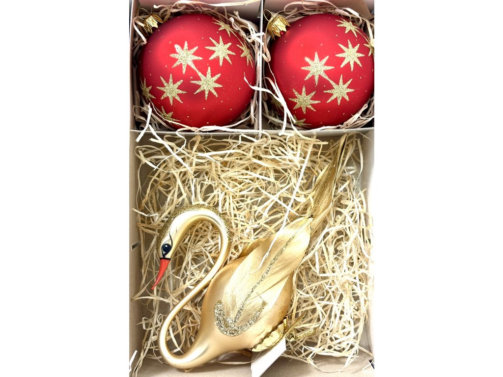 Luxusní sada vánočních ozdob – Zlatá labuť a dvě červené koule s hvězdami (8 cm + 12 cm)