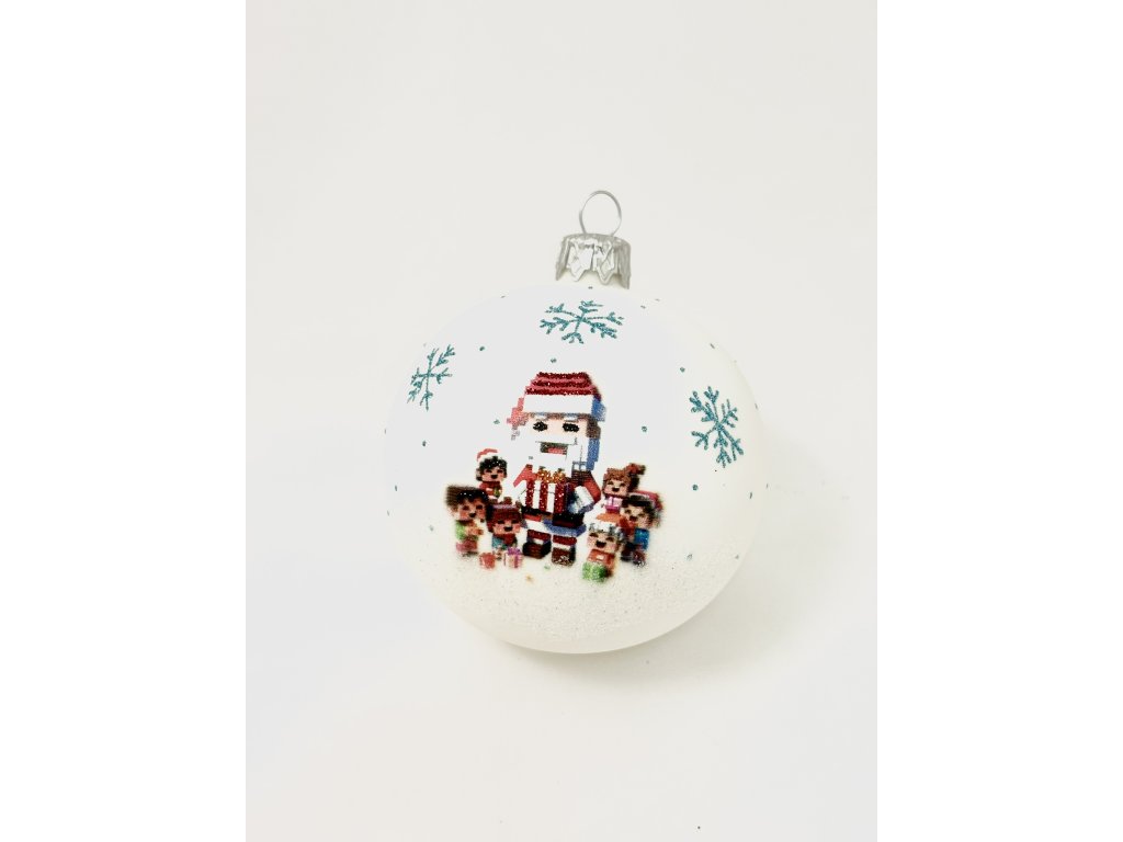 Pixelový Santa s dětmi – bílá skleněná koule 8 cm (s dárkovou krabičkou) IRISA