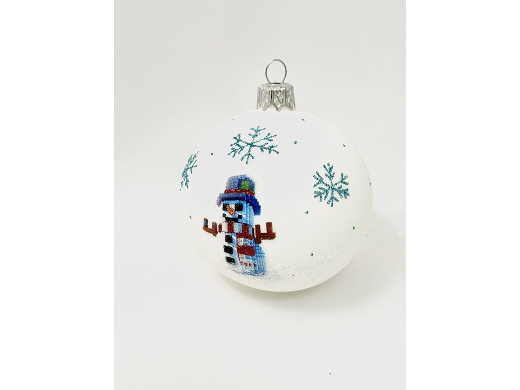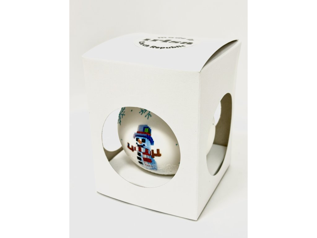 Pixelový sněhulák s vysokým kloboukem – bílá skleněná koule 8 cm (s dárkovou krabičkou) IRISA