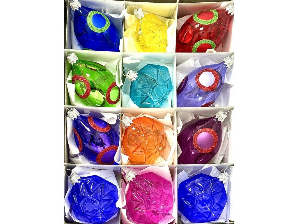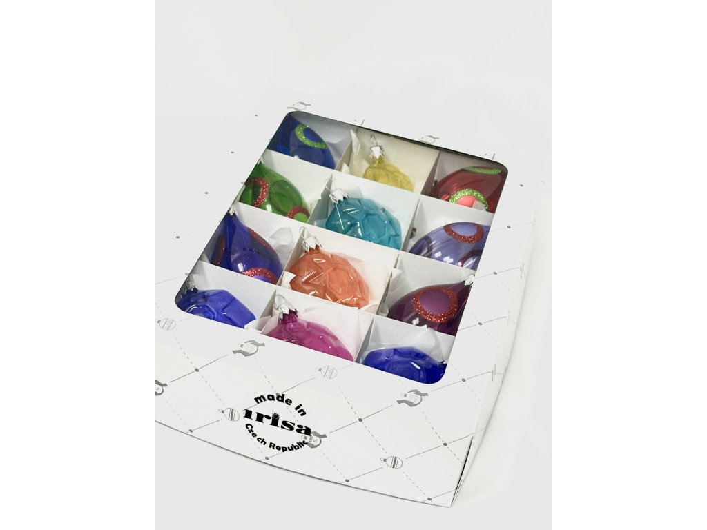 Tato výjimečná sada vánočních ozdob je poctou zlaté éře českého sklářství. Kombinuje 6 elegantních oliv a 6 originálních ozdob ve tvaru kamene, které dohromady vytvářejí jedinečně hravý a pestrý celek. Každá ozdoba je ručně foukaná a dekorovaná výraznými barvami – od sytě modré a smaragdové po růžovou, oranžovou či žlutou. Třpytivé prstence, geometrické výbrusy i retro design dodávají této sadě nezaměnitelné kouzlo 60. a 70. let, kdy se české sklo stávalo ozdobou stromků po celém světě. Tyto ručně vyráběné ozdoby vyniknou jak na klasickém vánočním stromku, tak v moderním interiéru, kde vytvoří atmosféru radosti, barev a nostalgie. Každý kus je originál — žádná sada nebude stejná. Unikátní kolekce, která propojuje tradici, ruční práci a retro eleganci.