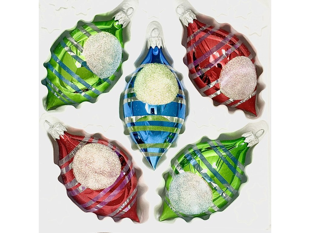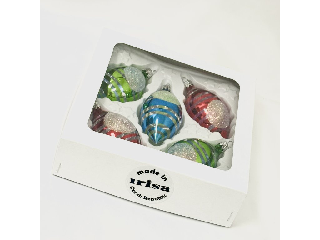 Tato unikátní sada vánočních ozdob v retro stylu vás přenese do dob, kdy byly české skleněné ozdoby symbolem elegance a poctivé ruční práce. Pět originálních oliv o velikosti 7 cm kombinuje tradiční tvar s výraznými barvami – červenou, zelenou a modrou – doplněnými o charakteristické pruhy a bílý pískový střed. Každý kus je ručně foukaný a malovaný zkušenými dekoratérkami z Valašska, které zachovávají tradiční techniky výroby. Při světle svíček či žárovek se tyto ozdoby nádherně třpytí a vytvářejí teplou, domáckou atmosféru. Ideální pro milovníky klasických českých Vánoc, kteří chtějí ozdobit svůj stromek s noblesou a vzpomínkou na dětství. Sada je dodávána v elegantní krabičce a představuje i krásný dárek pro sběratele retro ozdob.