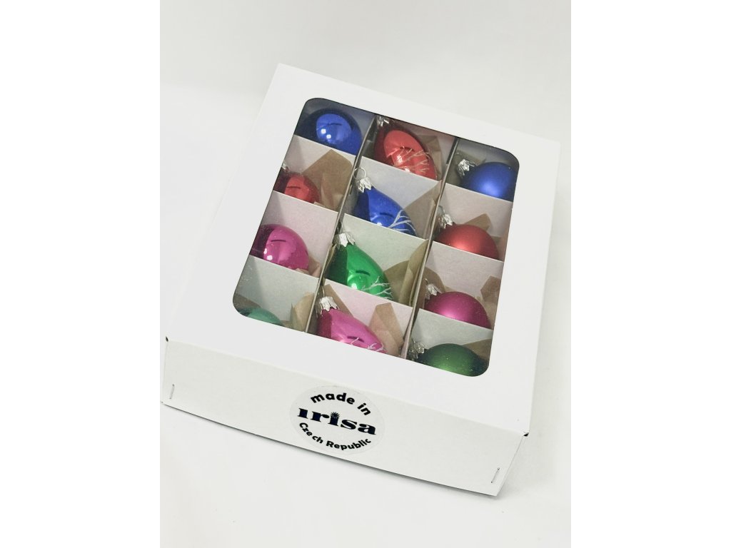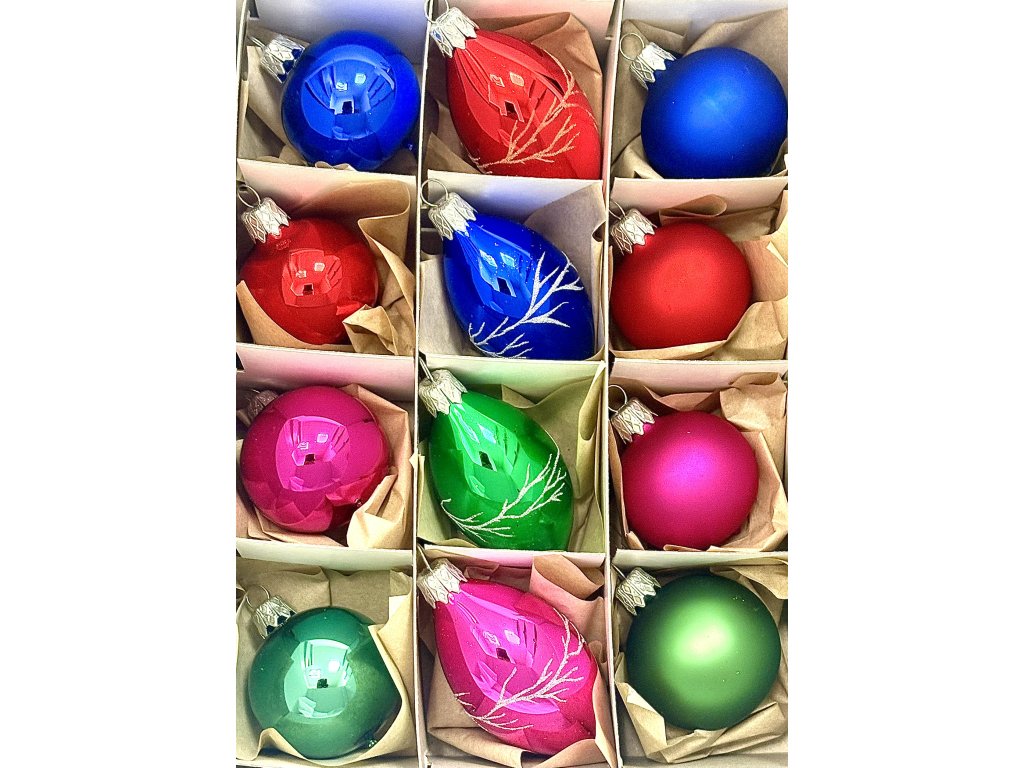 Retro sada vánočních ozdob v živých barvách – koule 5 cm a olivy 7 cm (unikát)