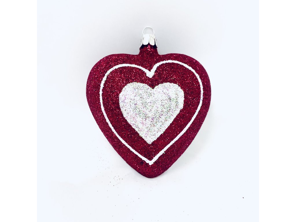 Růžové skleněné srdce s dekorem srdce v srdci ( velikost 10 cm v dárkové krabičce )