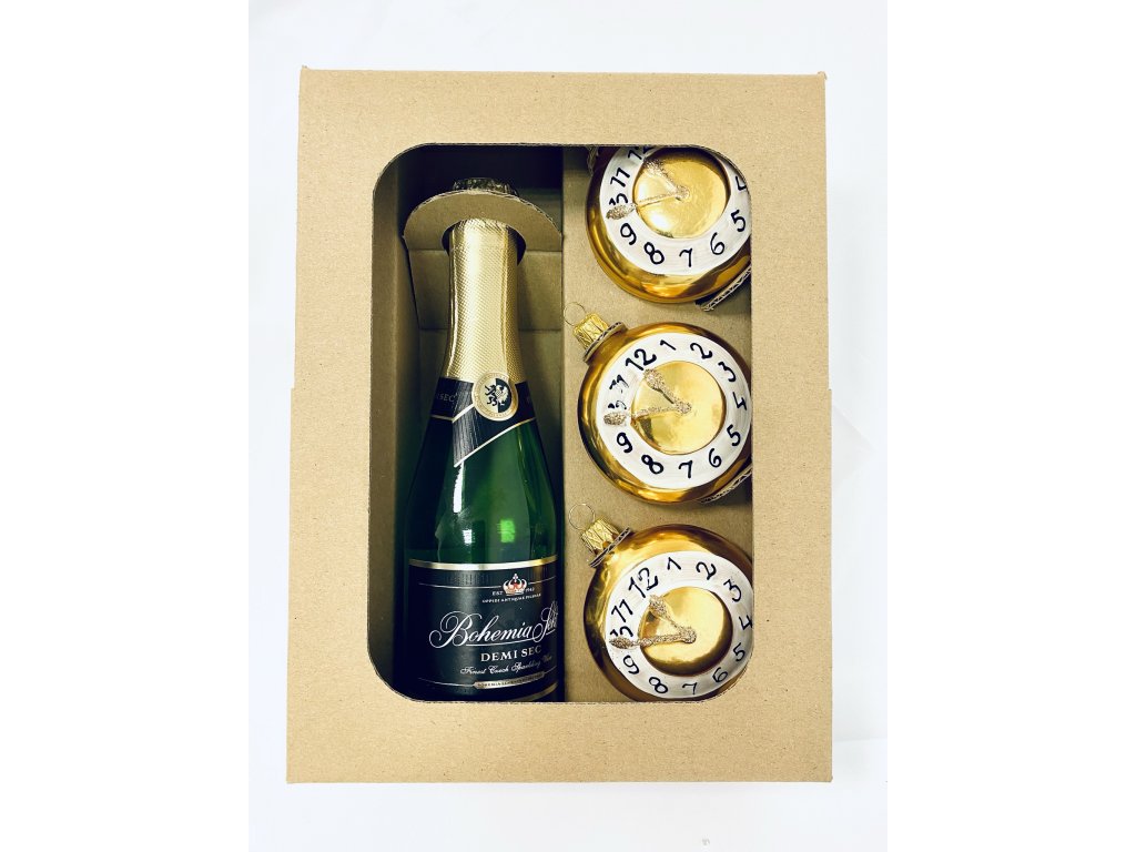 Sada obsahuje Bohemia Sekt demi sec 0,2l a 3ks vánočních skleněných ozdob zlaté barvy se zlatou záponkou symbolizující staré dobré časy. Skleněné ozdoby jsou foukané zručnými skláři - 100% ruční výroba
