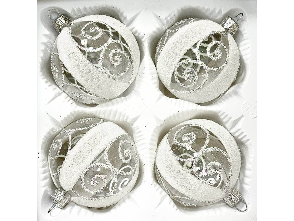 Sada bílých vánočních koulí s průhlednými pásy – Zimní elegance ve skle ( 4 ks, 7 cm )
