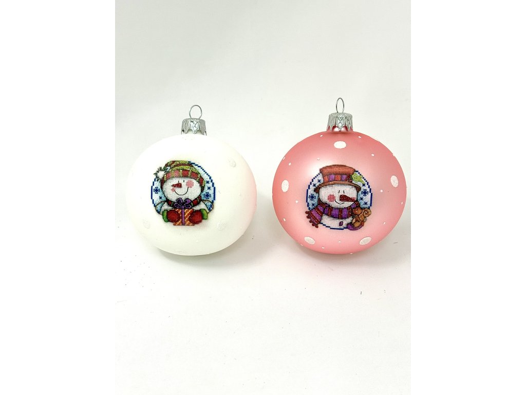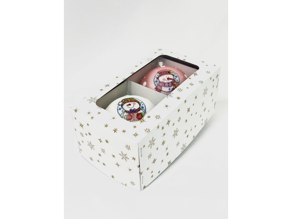 Sada dvou vánočních koulí se sněhuláky – bílá & růžová – 8 cm – 2 ks (s dárkovou krabičkou) IRISA
