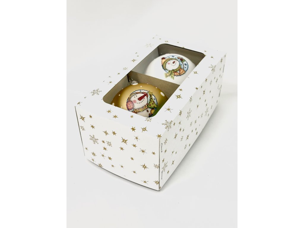 Sada dvou vánočních koulí se sněhuláky – bílá & zlatá – 8 cm – 2 ks (s dárkovou krabičkou) IRISA
